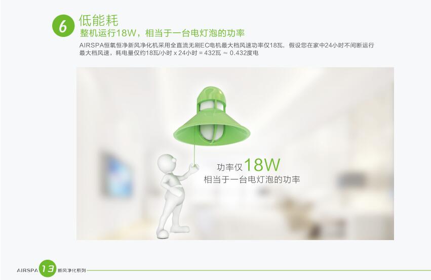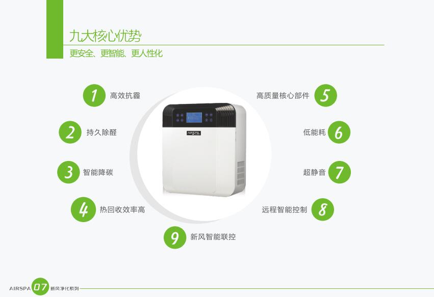 AIRSPA恒氧恒凈新風凈化機秉承節(jié)能低碳的理念,采用能量回收裝置,是室內(nèi)外新污空氣在交換的過程中同時進行能量交換,能量交換率達到了70%以上。