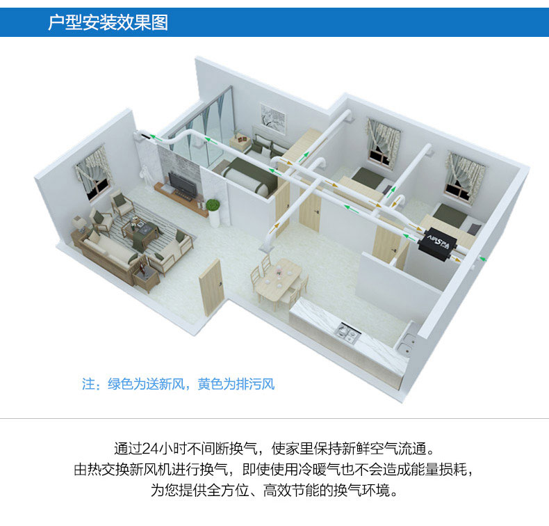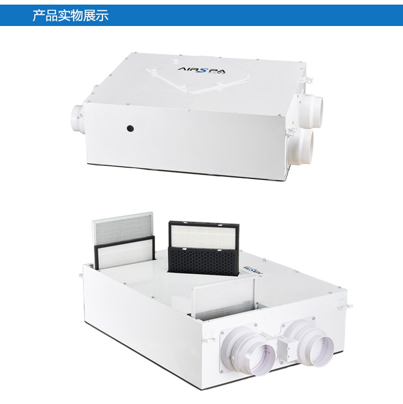 雙向流新風機:訂機采用雙核動力設計,動力強,體積小;采用直流無刷電機,低噪音,低能耗